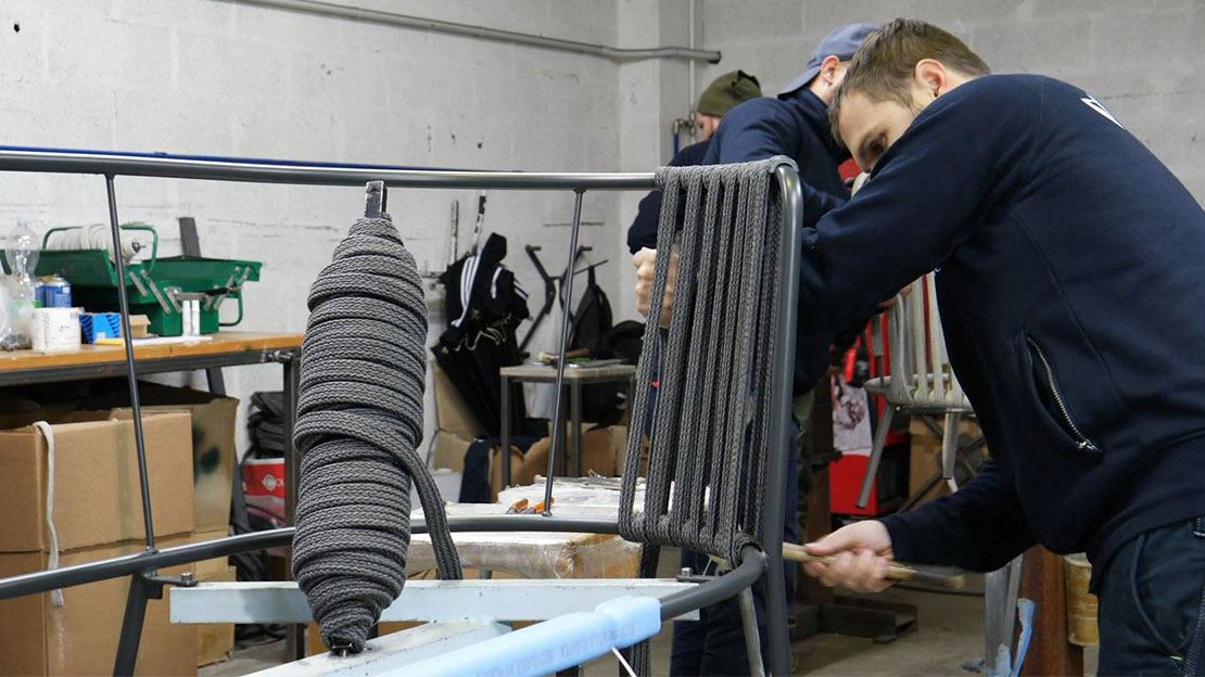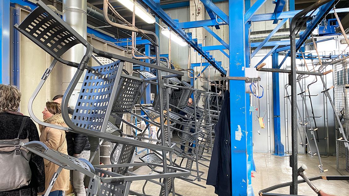 Près de Pérouse, chez notre fabricant de meubles de jardin en acier, naissent par exemple la célèbre ligne de produits Granada ainsi que de nombreux autres meubles de jardin en acier colorés. Nous avons pu suivre les différents processus de création. La fabrication est en grande partie manuelle – les montants en acier sont soudés individuellement à la main. Les structures sont ensuite galvanisées et revêtues par poudrage. Les tressages rope assortis sont tous tendus et tressés à la main. Nous avons pu nous essayer au tressage et certains d'entre nous ont été étonnés de la force et de l’habileté nécessaires.