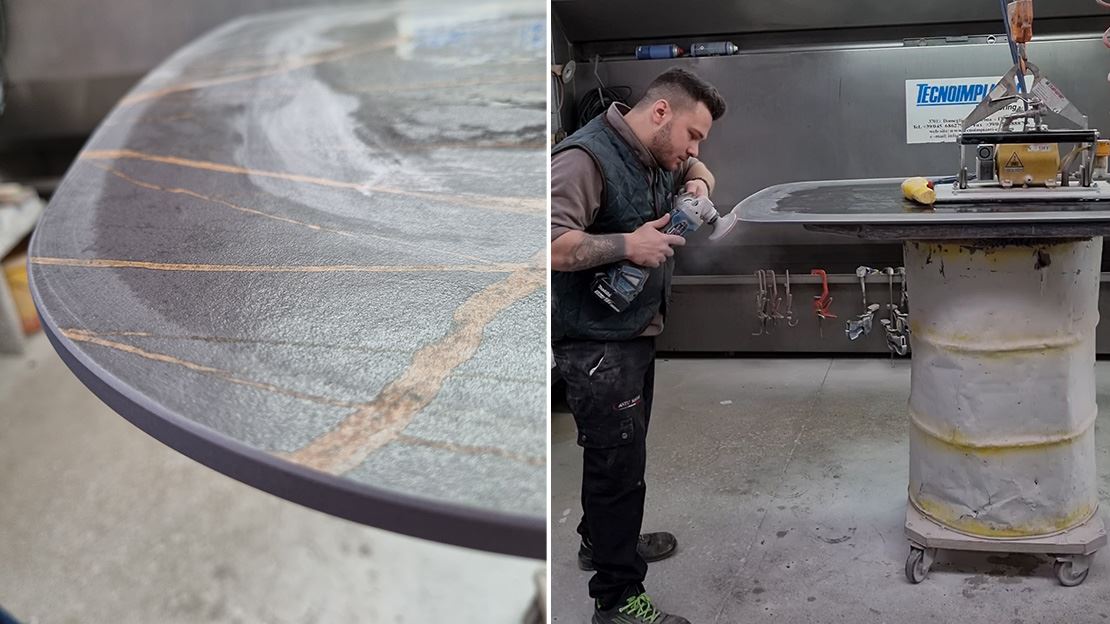 Dans le Nord de l’Italie, nous avons appris comment se déroule la fabrication des plateaux de table en céramique. Il y a ici de nombreux spécialistes qui découpent les plateaux et polissent habilement à la main les différentes finitions de table.