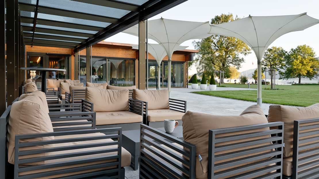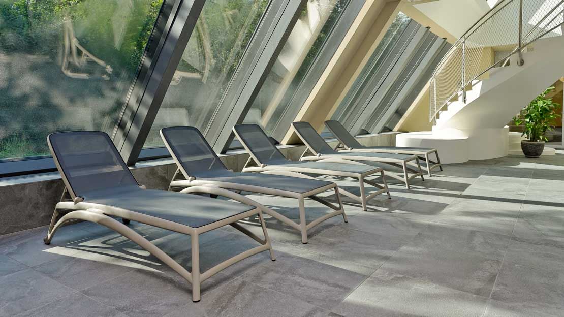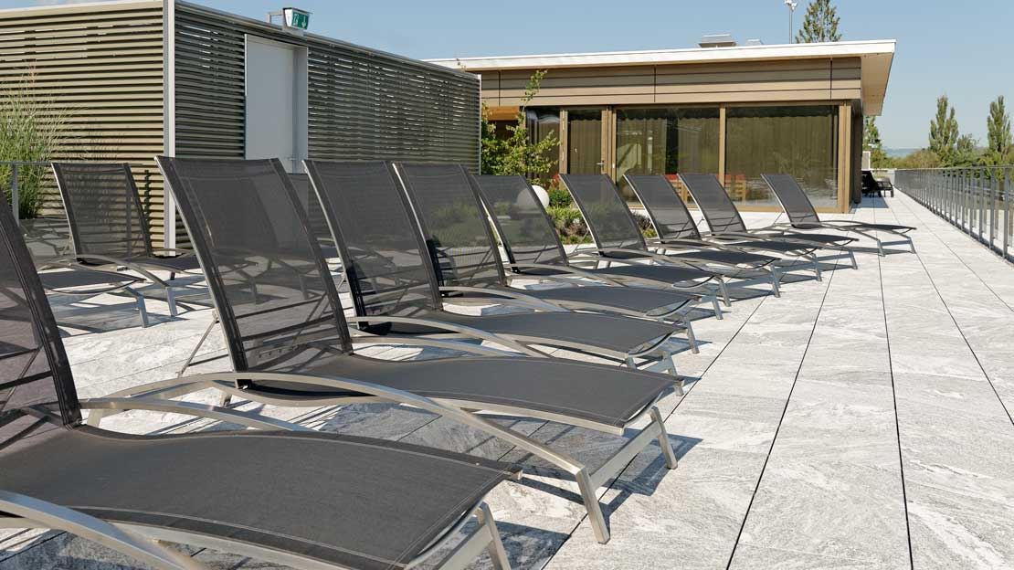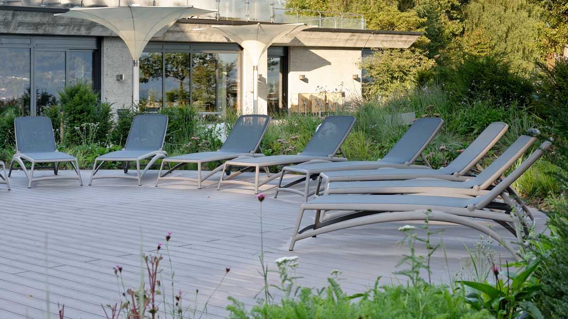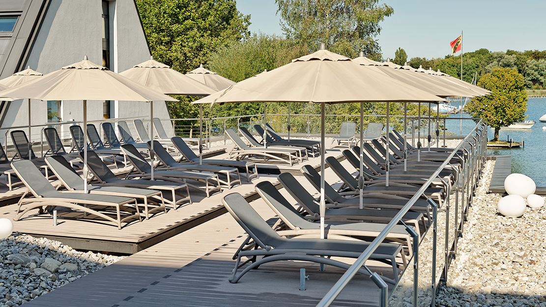 Le Deltapark Vitalresort à Gwatt offre à ses clients un refuge exclusif directement au bord de l’eau, où détente, activité et nature se combinent harmonieusement. Le vaste espace extérieur invite à trouver le calme et à profiter de l’atmosphère particulière d’un environnement proche de la nature. Équipé du lounge de jardin en aluminium MIAMI élégant ainsi que des confortables bains de soleil LUZERN, il crée une ambiance moderne et haut de gamme. Complété par des parasols GLATZ, il assure également une ombre agréable et un confort supplémentaire. Idéal pour des heures de détente placées sous le signe du bien-être et de la relaxation.