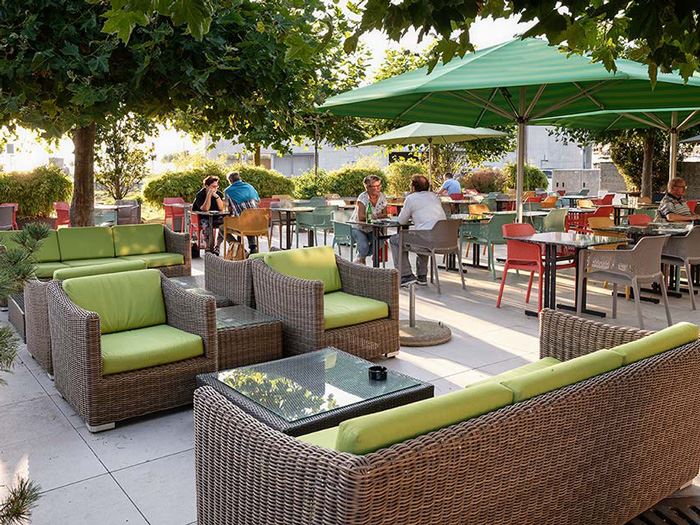 Auch im Bereich der professionellen Aussenmöblierung verschmelzen Innen- und Aussenbereich immer mehr. Passen Sie die Möbel im Aussenbereich Ihrem Unternehmen und Ihren Zielgruppen an. Übernehmen Sie, wenn möglich, auch den Stil der Innenmöbel. Dadurch verleihen Sie Ihrem Unternehmen ein einheitliches Erscheinungsbild.