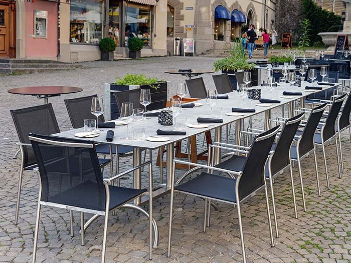 Für grössere Gruppen oder Events müssen Sie in der Lage sein, das bestehende Mobiliar zu einer grossen Tafel zusammenzustellen. Dafür eignen sich quadratische oder rechteckige Gartentische mit Mittelfuss.
