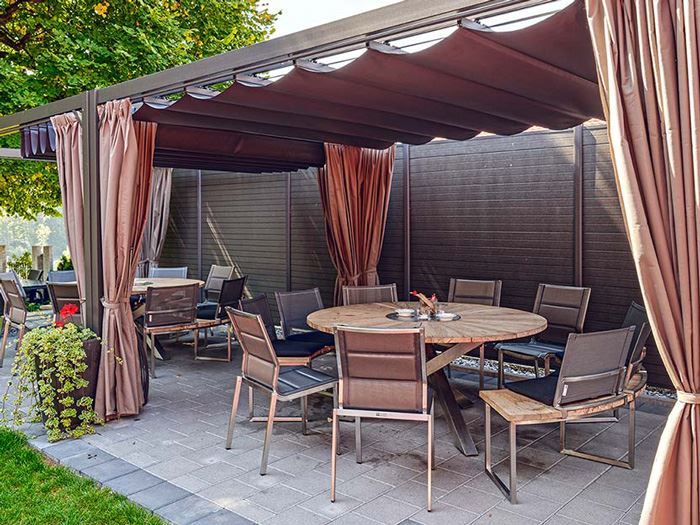 Ganzjährige Aussengastronomie liegt im Trend. Mit Überdachungslösungen, in Form einer Pergola, ermöglichen Sie Ihren Gästen ganzjähriges Dinieren im Aussenbereich. Das schliessbare Dach schützt vor Sonne und Regen. Das Sonnendach kann für sonnenhungrige Gäste innert Sekunden problemlos geöffnet werden. Zusätzliche Seitenwände schützen vor Wind.