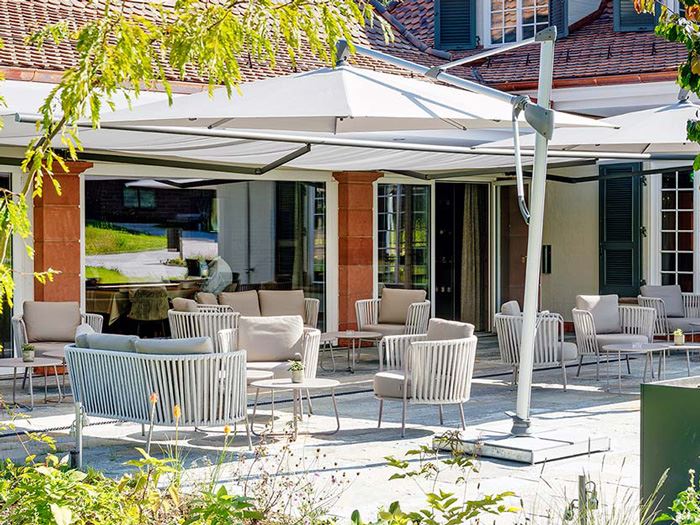 Eine professionelle Beschattungslösung mit Sonnenschirmen ist gleichermassen wichtig wie Terrassenstühle und Tische. Sonnenschirme werden mittlerweile länger und oft sogar ganzjährig genutzt, bei Sonne und Regen. Optisch abgestimmte und passende Sonnenschirme werten Ihre Terrasse auf. Die Farbauswahl bei den Schirmbezügen ist gross. Auch in Sachen Zubehör wird heutzutage vieles angeboten: Von Beleuchtungsmodulen über Heizstrahler bis hin zu Regenrinnen und Seitenwänden sind Sonnenschirme ganzjährige Begleiter. Ob fix verankerte Grossschirme oder kleinere, flexiblere Mittelstock-/Ampelschirme besser zu Ihrem Betrieb passen, hängt von der Situation vor Ort ab. Installieren Sie, wenn immer möglich, eine fix einbetonierte Bodenhülse und planen Sie diese frühzeitig ein. Für kleine, verwinkelte Plätze oder auch temporäre Aussenbereiche eignen sich Ampelschirme. Kleine Mittelstockschirme bieten hingegen viel Charme – sie sind auch windstabiler als Ampelschirme.