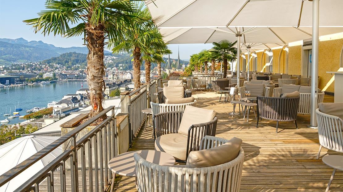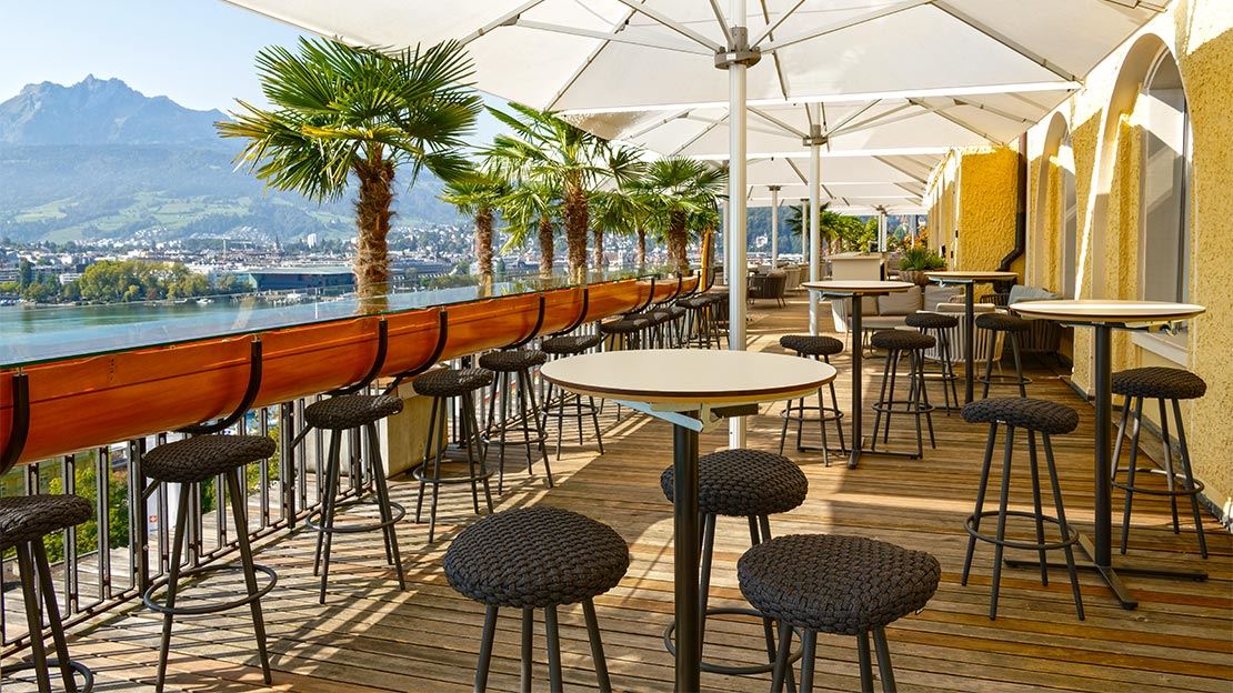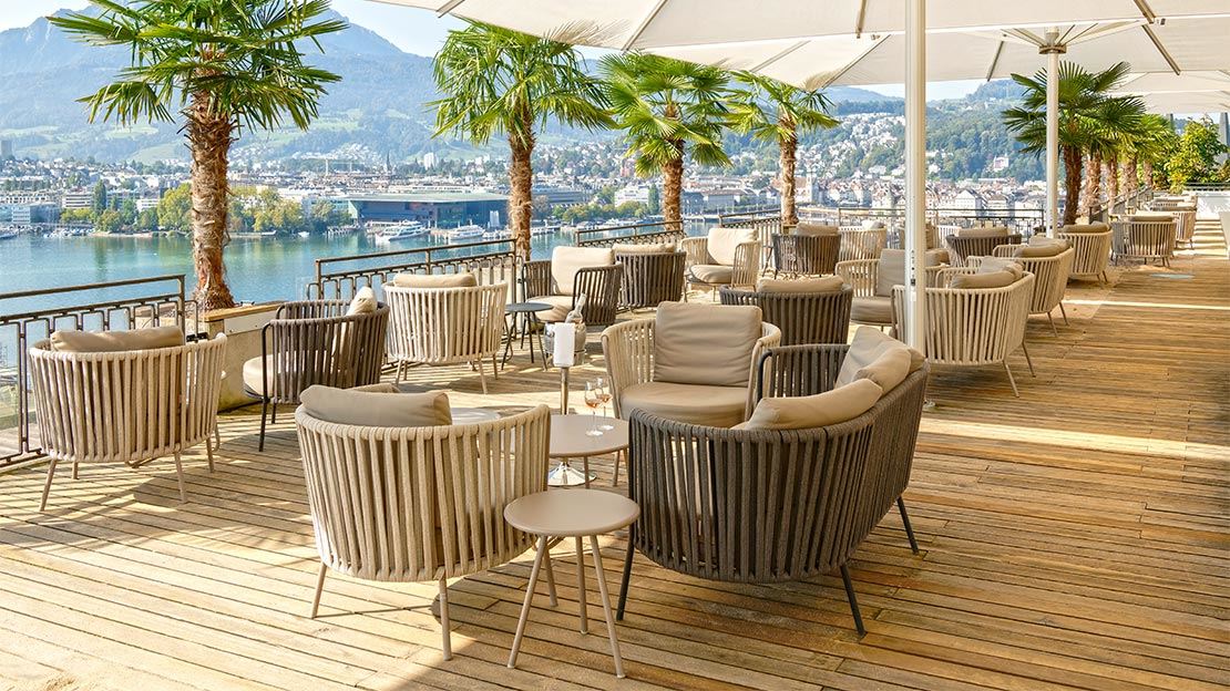 Der MONTANA Beach Club zählt zu den Top 10 der beliebtesten Rooptop-Bars der Schweiz. Sonne, Palmen und Sand sowie ein atemberaubender Blick über den Vierwaldstättersee und die Zentralschweizer Berge machen den Besuch zu einem Erlebnis. Bei der Aussenmöblierung setzte das Art Deco Hotel Montana auf hochwertige und lauschige Loungemöbel mit Rope-Geflecht. Die Kombination von zwei verschiedenen Schnur-Farben verleihen der Terrasse pepp und trotzdem die nötige Ruhe. Lounge- und Beistelltische stammen aus derselben Modellserie GRANADA. Dazu lassen sich die Barhocker KAPSTADT mit klappbaren Bartischen der Serie STOCKHOLM kombinieren. Die grossen Gastroschirme der Firma Glatz sorgen für den nötigen Sonnen- und Regenschutz. Die Terrasse lädt förmlich ein zum Hinsitzen und Relaxen - Ferienfeeling pur!