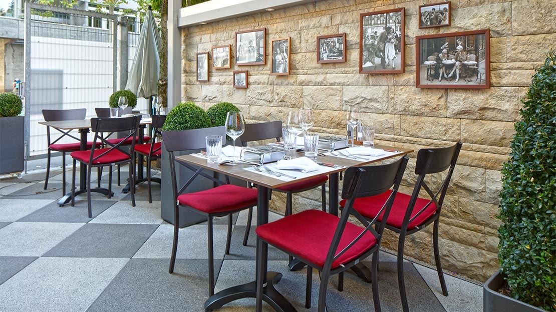 Unkompliziertes Ambiente mitten im Kreis 4 - so präsentiert sich die Brasserie Café de Paris. Klein aber fein ist auch die schöne Terrasse, welche mit viel Liebe zum Detail eingerichtet wurde. Passend dazu wurden die Stahl Gartenstühle Alicante in der Farbe bronze mit roten Sitzkissen für den höheren Sitzkomfort sowie klappbare Trento Tischgestelle mit HPL Tischplatten im Dekor Classic rost ausgewählt. Die Gartentische lassen sich je nach Bedarf und Gästeanzahl individuell zusammenstellen.