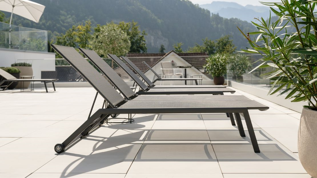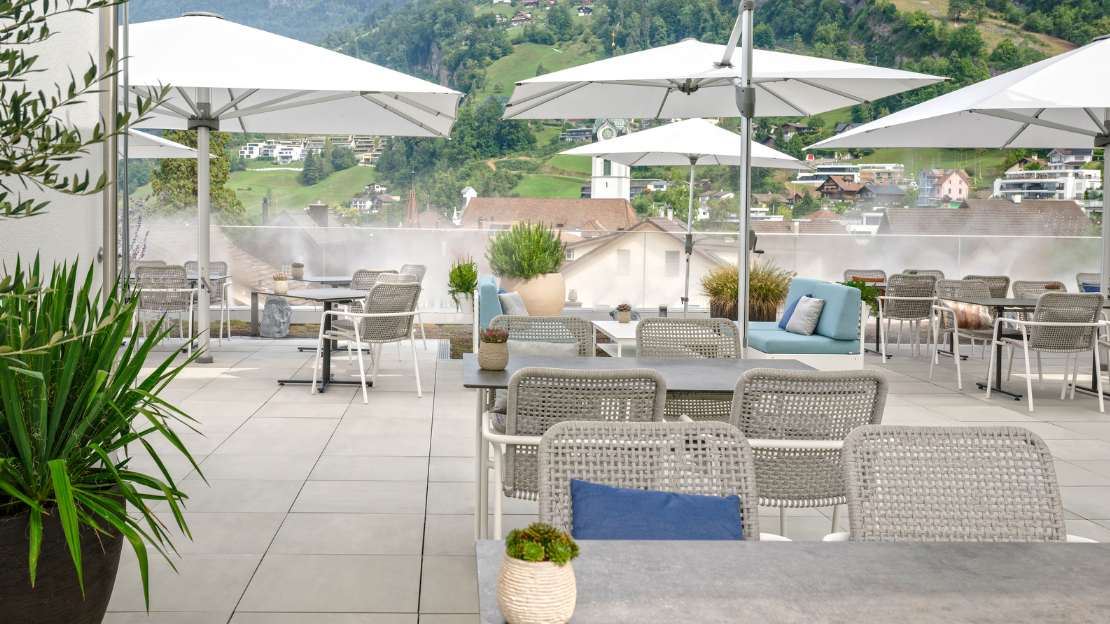 Die Neuro Culinary Center AG (NCC) schafft Innovationen in der Hotellerie und im Gastgewerbe, indem sie Produkte, Prozesse und Präzisionen im Bereich der Kulinarik weiterentwickelt. Die wunderschöne Dachterrasse wurde ausgestattet mit grossen Gastro-Sonnenschirmen, passend dazu moderne PALMA Gartenstühle und STOCKHOLM Tische in der Optik HPL Beton silber.