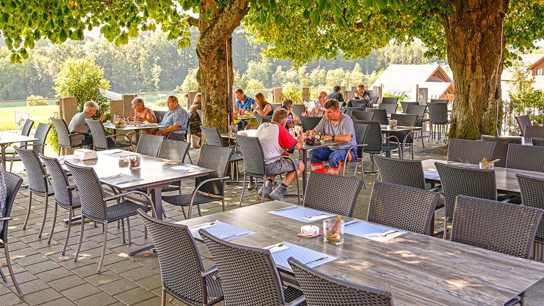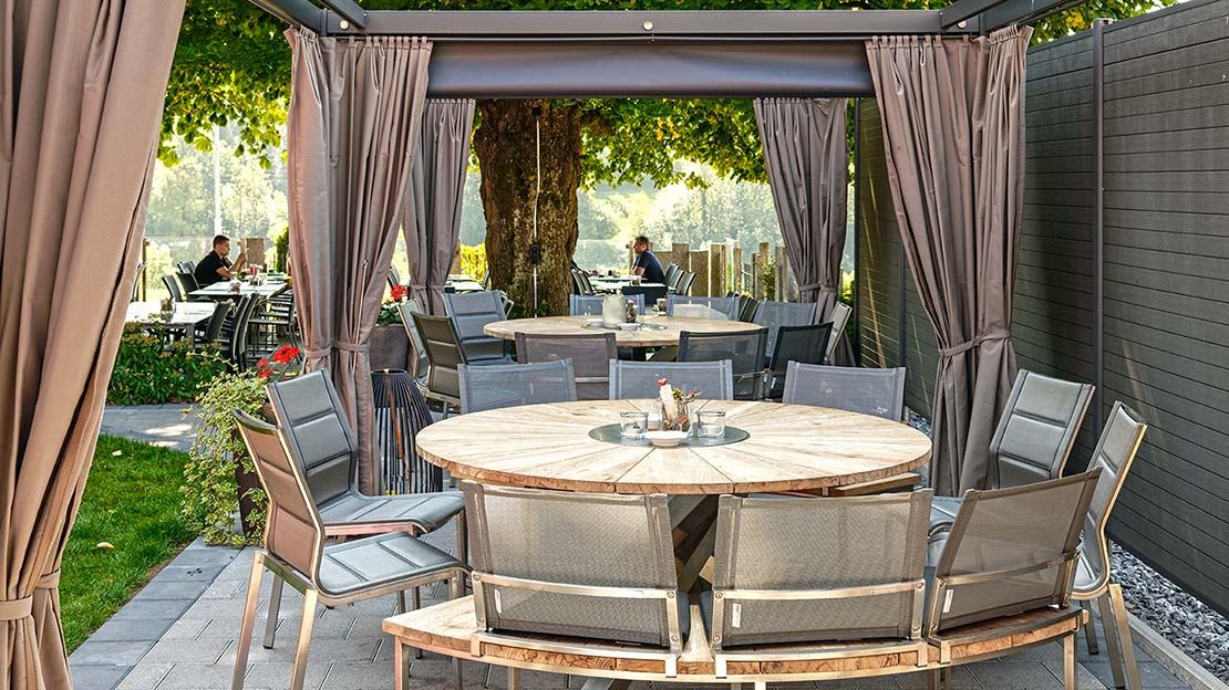 Mit der überdachten Pergola schafft das Restaurant Oberli in Walliswil b. Niederbipp gemütliche Verweilzonen für ihre Gäste. Ob als Schattenspender oder schützend bei einem Sommerregen, durch das praktische PVC Schiebedach und die schön fallenden Seitenvorhänge lässt sich die Pergola den verschiedensten Wünschen anpassen. Der Gartenpavillon ist absolut wetterbeständig und kann ohne Bedenken das ganze Jahr draussen stehen gelassen werden. Für viel Gemütlichkeit sorgen die runde Gartenlounge SOLEIL sowie die runden Gartentische ALASKA mit den dazu passenden Bänken kombiniert mit PORTO Gartenstühlen in Edelstahl. Die grosszügige Terrasse ist mit hochwertigen CURVE Gartenstühlen und klappbaren HPL Gartentischen ausgestattet. Auch der Raclettekeller bietet eine besondere Atmosphäre, ausgestattet mit den modernen LIDO Barstühlen und dem eleganten SCHILTHORN Bartisch. Der perfekte Ort für gesellige Abende. Einfach herrlich, einen gemütlichen Abend unter den schattenspenden Bäumen bei einem feinen Essen zu geniessen.
