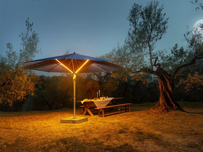 Der FORTELLO® LED von Glatz ist der Schirm für Tag und Nacht. Schützt er tagsüber vor Sonne und Regen, sorgt er abends dank den in den Streben integrierten LED Streifen für ein warmweisses Licht – wahlweise in zwei Helligkeitsstufen einstellbar. Aufgrund seines gegenläufigen Servo-Öffnungsprinzips lässt er sich leicht bedienen und dank zweiteiligem, profiliertem Mast sowie geringem Gewicht vielerorts einsetzen. Material und Technik: Das Gestell ist aus natureloxiertem Aluminium. Schieber und Krone sind aus robustem Aluminium-Druckguss, Schrauben und Nieten sind aus Edelstahl. Der Schirmbezug ist auswechselbar und dank den flexiblen Streben selbstspannend. Bedienung: Einfach den Spannhebel nach unten ziehen und im Schieber einhängen. Durch das gegenläufige Servo-Prinzip gelingt dies mit minimalem Kraftaufwand.