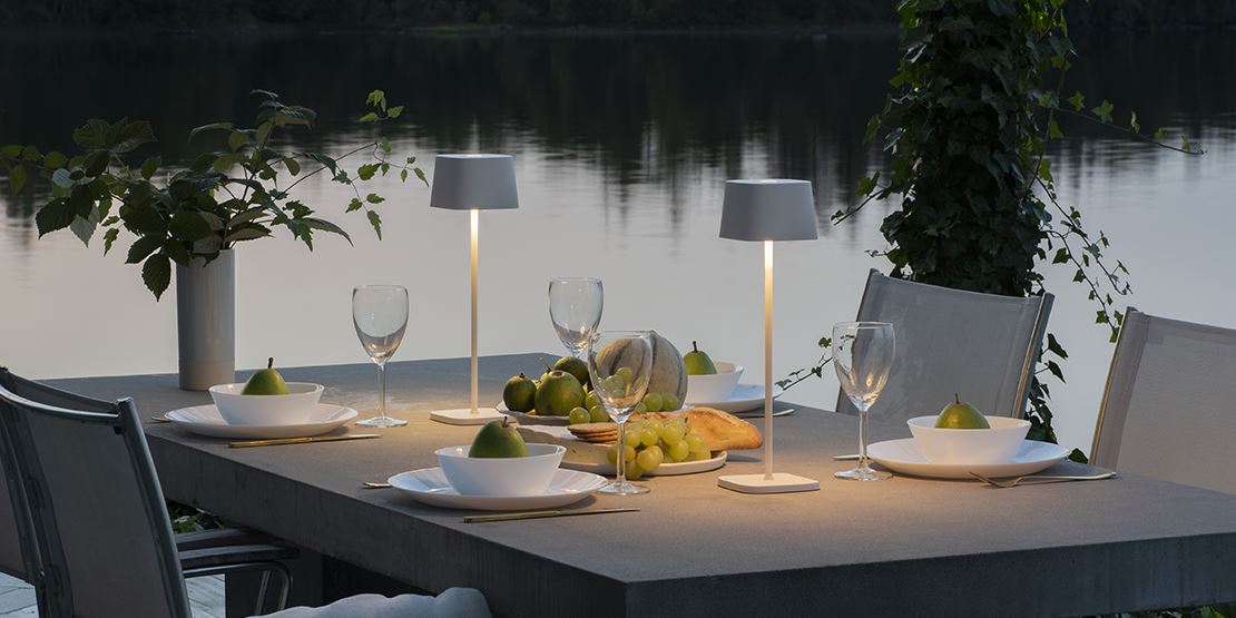 Schaffen Sie stimmungsvolles Licht in den Abendstunden mit praktischen Tisch- und Stehleuchten. Diese sind aus beschichtetem Aluminium und vielen Farben erhältlich. Die LED Leuchten sind mit einem Akku ausgestattet und stufenlos dimmbar. Die Farbtemperatur lässt sich individuell von 2700-3000 k einstellen.