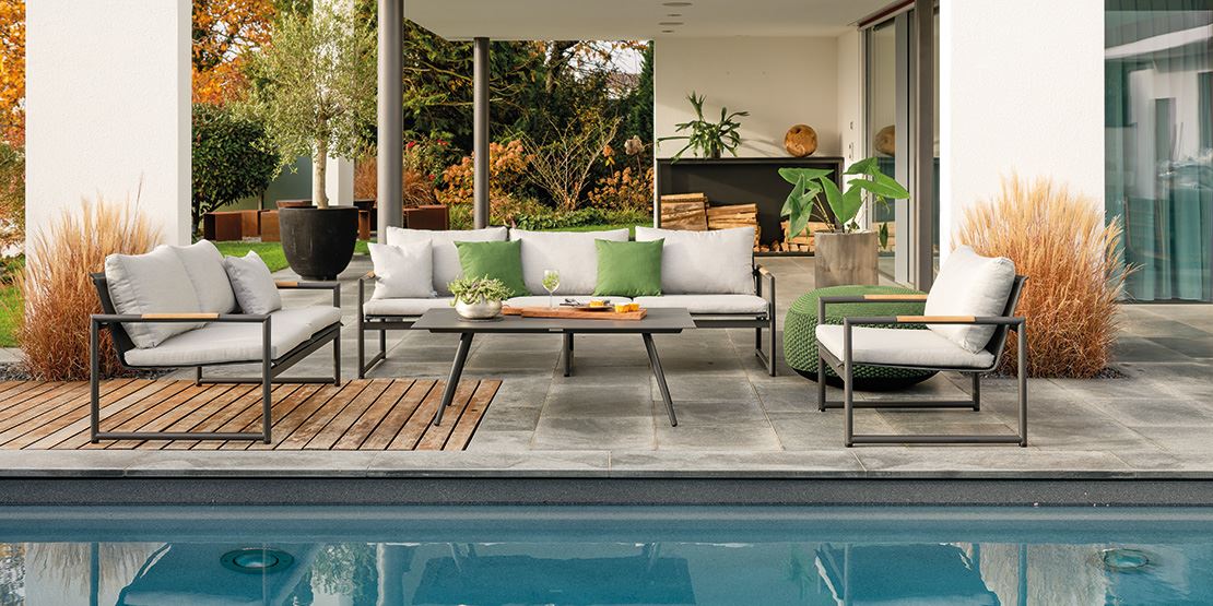 Beim Industrial-Style stehen robuste Materialien wie Edelstahl, Holz, Granit und Materialien mit Steinstrukturen im Vordergrund. Gekonnt wird modernes Design mit markanten Materialien vereint, so entsteht ein perfektes Spiel der Kontraste und der gewünschte Fabrik-Charme im Garten und auf der Terrasse.