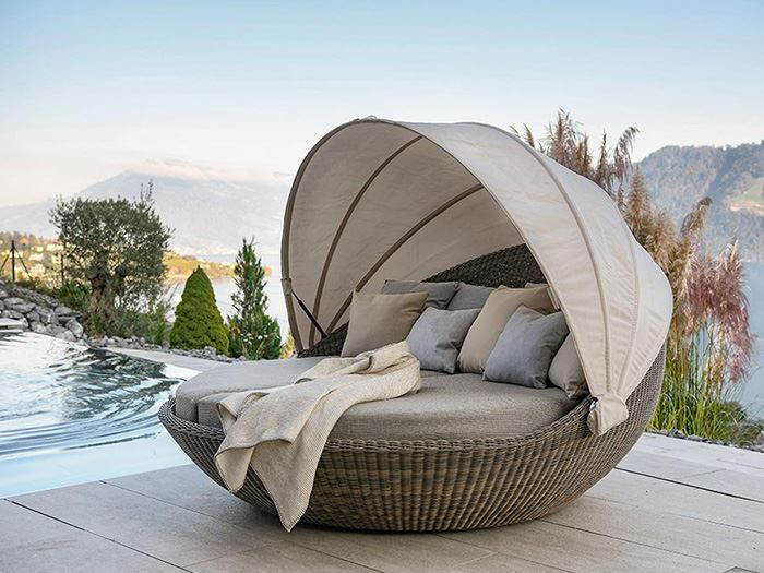 Unsere Sonneninsel PULA ist der richtige Ort für eine gemütliche Auszeit im Freien. Mit einem Durchmesser von 1.91 m bietet die PULA genügend Platz für zwei Personen und ist absolut wetterfest. Sie ist in vier verschiedenen Farben erhältlich und dazu jeweils kombiniert mit einem Dach in grau. Das abklappbare Stoffdach bietet viel Geborgenheit und schützt vor Sonnenlicht und unerwünschten Einblicken. Es lässt sich in zwei verschiedene Positionen verstellen. Diese Sonneninsel ist aus hochwertigem VIRO/ecolene Rattan gefertigt und verfügt über eine komfortable 360 Grad Drehfunktion mit Arretierungspunkten, damit fangen Sie bestimmt jeden Sonnenstrahl ein. Das grosse Liegekissen ist in verschiedenen Farben und Materialien erhältlich. Mit unterschiedlichen Zierkissen sorgen Sie für noch mehr Bequemlichkeit. Gemütlichen Sonnenstunden steht nichts mehr im Weg.